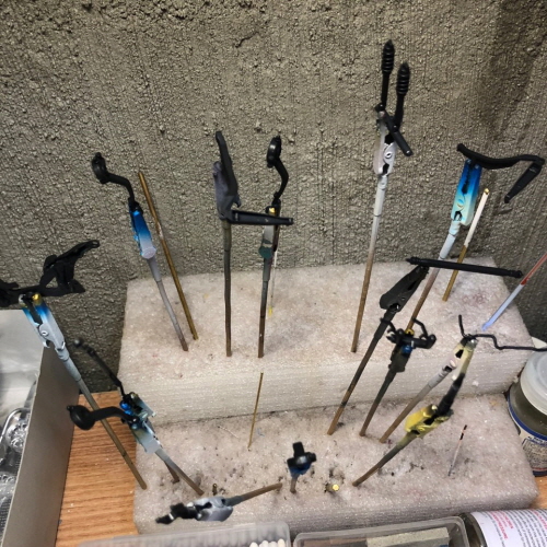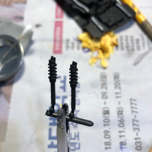 자잘한 부품들을 은 악어클립에 물린 다음 GSI락카 33번을 에어브러싱했습니다.