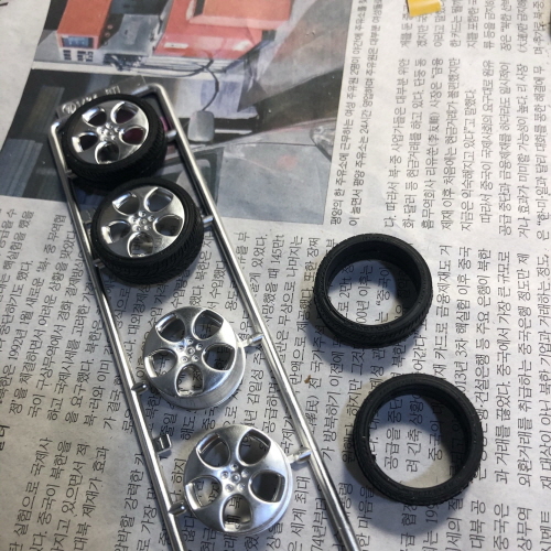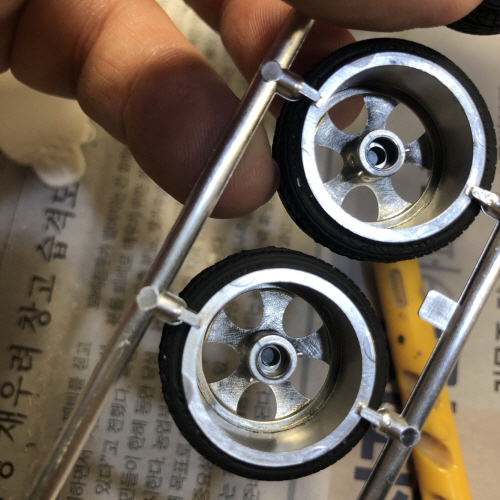 여차저차 휠을 끼우고 몇군데를 메탈릭 도료들로 살짝 드라이브러싱해서 도드라보이게 했습니다.
