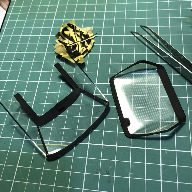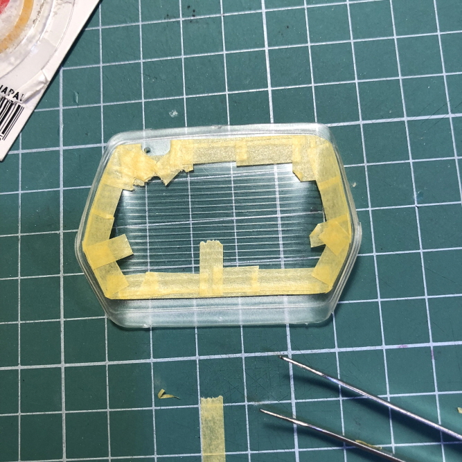 가느다랗게 자른 마스킹 테이프로 마스킹을 하고 안쪽에서 무광검정을 에어브러싱 했습니다.