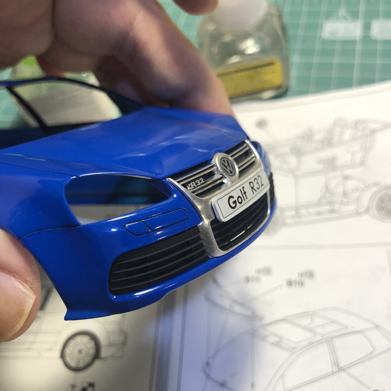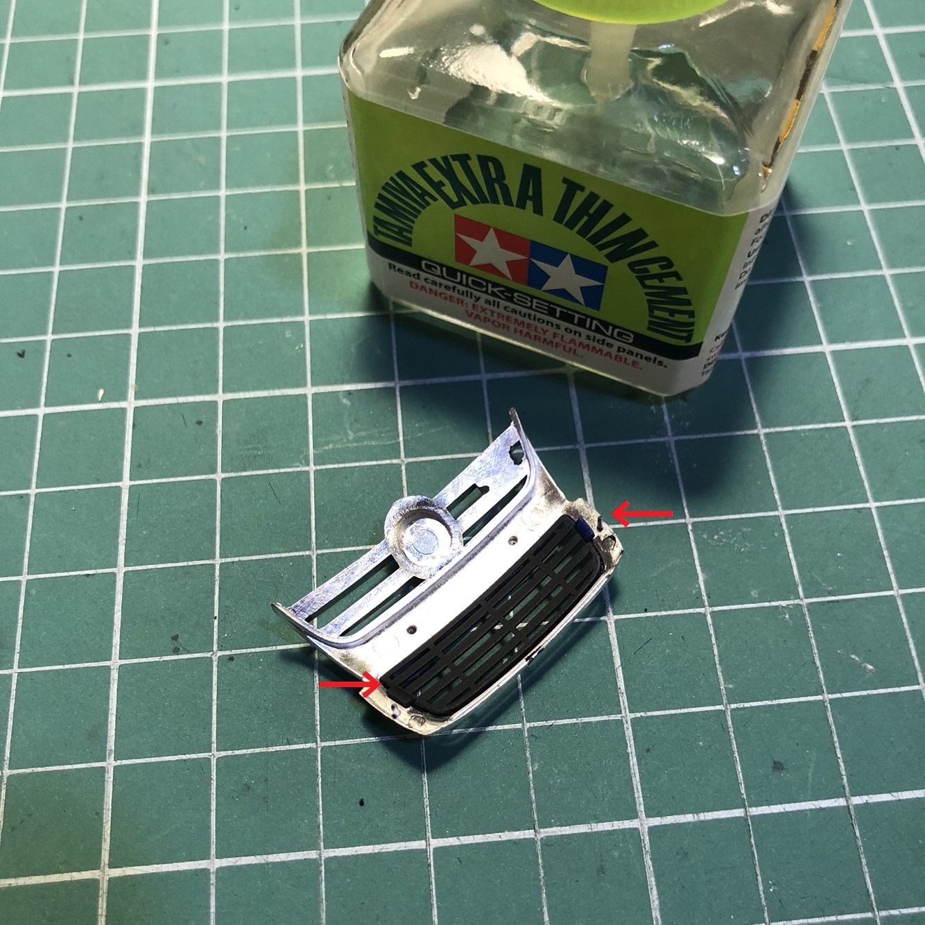 전면그릴은 부품을 맞추고 화살표로 표시한 부분에 무수지 접착제를 약간 흘려넣고 그대로 방치합니다.