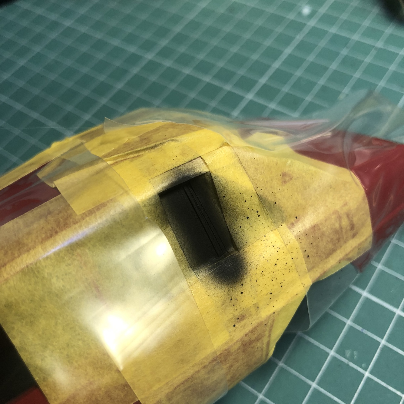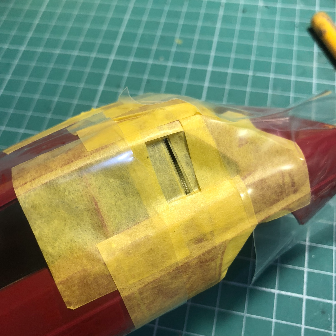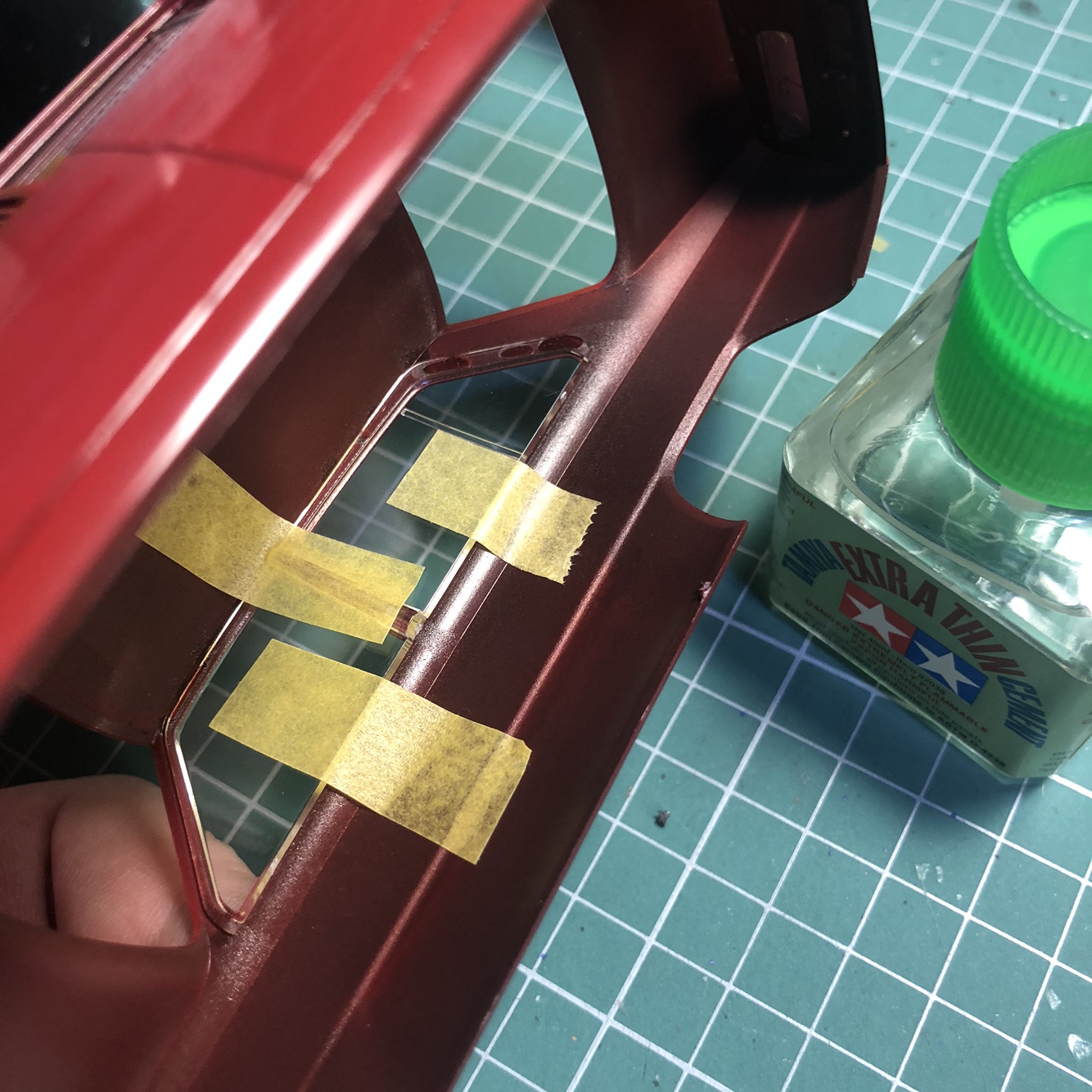 투명부품이 흔들리지 않도록 마스킹 테이프로 고정하고 졉착면이 넓은 부분에만 무수지 접착제를 조금만 흘려넣습니다.