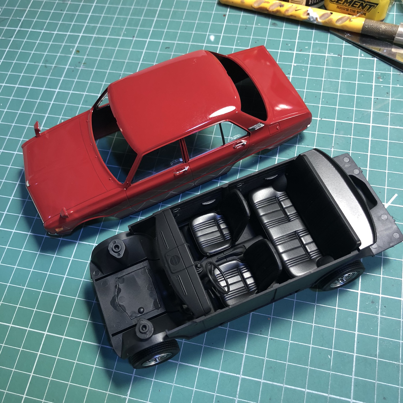 앞서 말했듯이 이 키트는 옆 유리창은 안쪽에서, 앞뒤 유리창은 바깥쪽에서 붙이는 특이한 구성입니다.