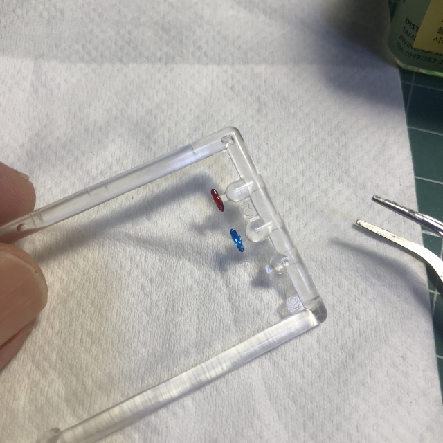 투명부품의 평평한 쪽에 클리어 에나멜로 색칠했습니다.
